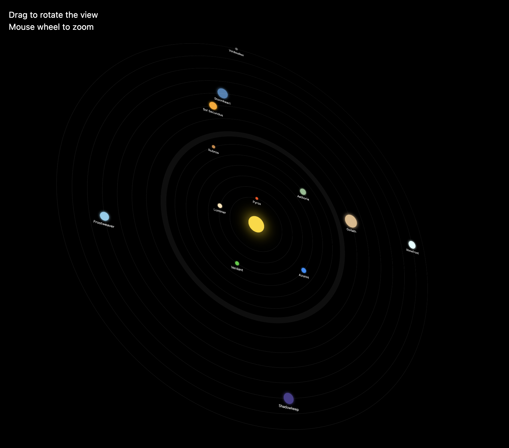 The Aethorian Solar System is a unique celestial arrangement featuring two suns and thirteen planets, each with its own distinct characteristics and magical properties. The system is divided into inner and outer regions by The Veil, a dense asteroid belt rich in magical minerals.